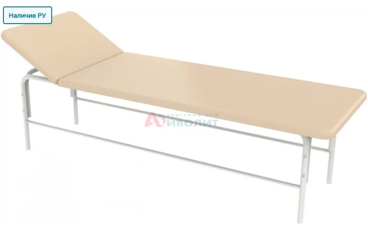 Кушетка медицинская для размещения пациентов при проведении осмотров, физиотерапевтических и массажных процедур. Каркас выполнен из профильной трубы, покрыт полимерно-порошковой краской светло серого цвета. Верхняя часть изготовлена из ДСП, поролона и обита искусственной кожей бежевого цвета, которая легко обрабатывается. Головная секция фиксируется в 3-х положениях.