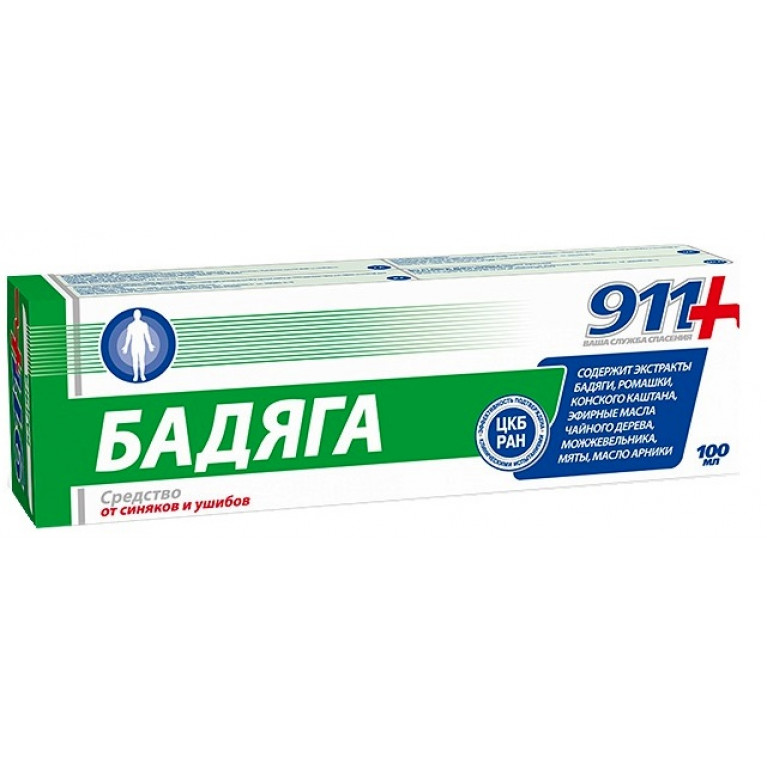 Гель для тела БАДЯГА - гелеобразная текстура от прозрачного до светло-жёлтого цвета. Средство создано на основе бадяги - уникального природного средства, которое обладает хорошим рассасывающим действием, улучшает защитные функции кожи. Содержит экстракты ромашки, конского каштана; эфирные масла чайного дерева, можжевельника, мяты, масло арники. Способствует более быстрой регенерации тканей кожи, уменьшению отеков. Помогает от ушибов и синяков, при пигментации кожи, выравнивает тон кожи, способстует улучшению состояния кожи. Способствует укреплению стенок кровеносных сосудов и капилляров, рассасыванию гематом, обладает антисептическим и успокаивающим действием. Способ применения и дозы: наносить средство на кожу легкими массирующими движениями 2-3 раза в день. Противопоказания: Непереносимость отдельных компонентов. Бадягу нельзя наносить на слизистую оболочку глаз и носа, в случае попадания средство нужно смыть водой.